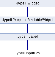 Viittaukset Jypeli.Widget.associatedListeners, Jypeli.InputBox.cursorBlinkTimer, Jypeli.InputBox.EraseText(), Jypeli.InputBox.InputText(), Jypeli.Game.Instance, Jypeli.Game.Keyboard, Jypeli.Keyboard.Listen() ja Jypeli.Timer.Start().