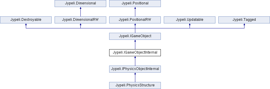 Jypelin sisäiset metodit ja propertyt joihin käyttäjän ei tarvitse päästä käsiksi kuuluvat tähän luokkaan. Kaikki oliot jotka toteuttavat IGameObject-rajapinnan toteuttavat myös IGameObjectInternal-rajapinnan. Ota tämä huomioon jos aiot tehdä oman olion joka toteuttaa suoraan IGameObject(Internal)-rajapinnan.