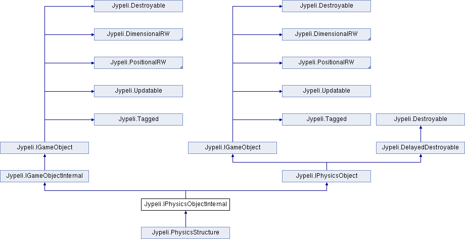 Jypelin sisäiset metodit ja propertyt joihin käyttäjän ei tarvitse päästä käsiksi kuuluvat tähän luokkaan. Kaikki oliot jotka toteuttavat IPhysicsObject-rajapinnan toteuttavat myös IPhysicsObjectInternal-rajapinnan. Ota tämä huomioon jos aiot tehdä oman olion joka toteuttaa suoraan IPhysicsObject(Internal)-rajapinnan.